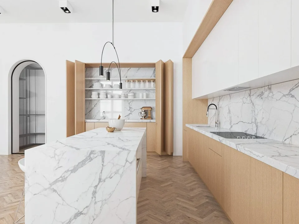 - Doğal taş tezgâhlar: Traverten, mermer, kuvars gibi seçenekler.