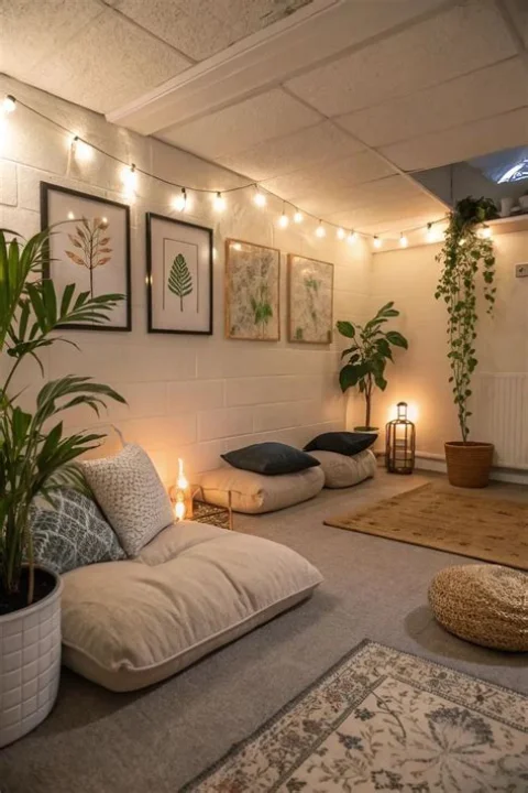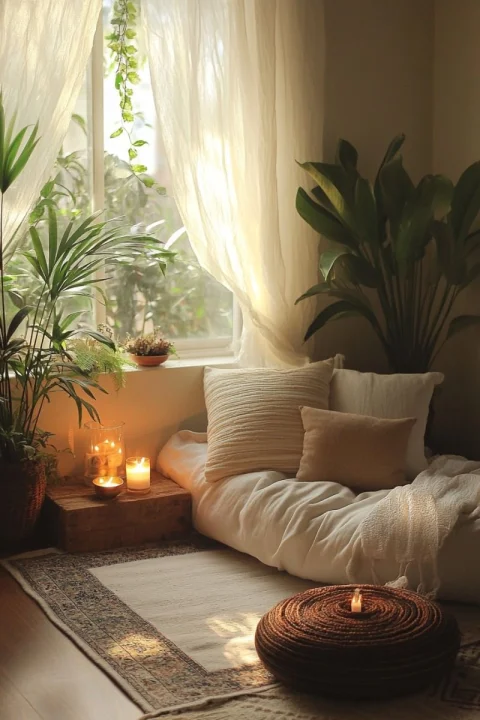 - Yumuşak zeminler: Yoga matları, doğal kilimler veya minderler konforlu bir oturum sağlar.